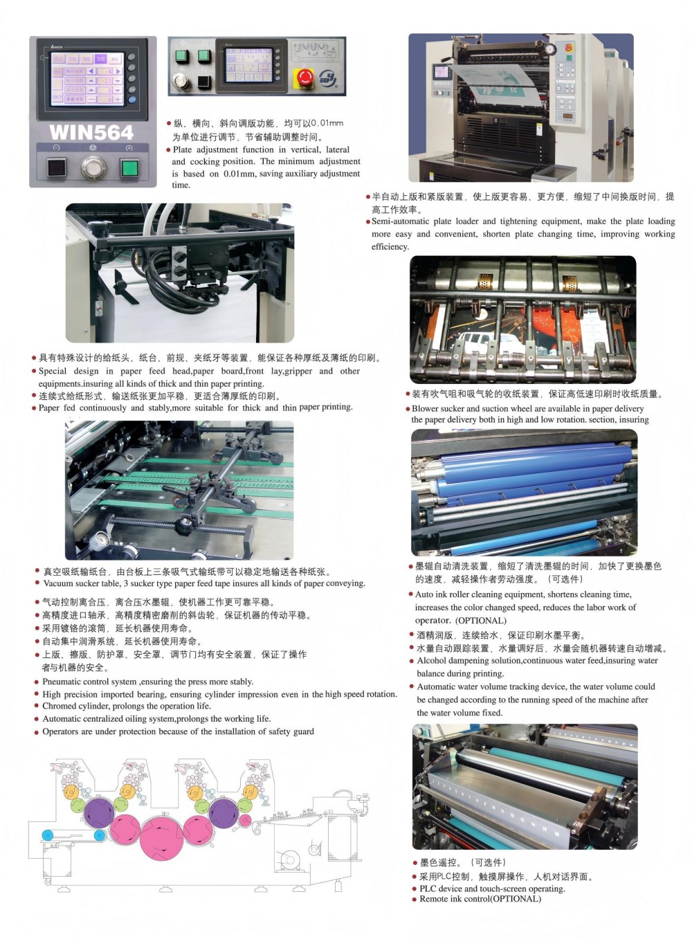 Presa de imprimare offset de etichete A2 în patru culori este proiectată cu module de înaltă performanță și toate sunt de calitate superioară - role și roți dințate de înaltă precizie, un mecanism puternic de alimentare cu hârtie, un sistem de înregistrare a hârtiei de înaltă precizie și un sistem stabil de alimentare cu cerneală. Este conceput pentru a satisface cerințele pieței pentru imprimarea color pe coli tăiate, care este de înaltă calitate, eficientă și accesibilă. Nici nu trebuie să rămâneți la o singură grosime de hârtie - funcționează cu hârtie subțire (0,04 mm) până la carton gros (0,4 mm). Există, de asemenea, un control tactil cu o interfață de programare intuitivă, permițându-vă să ajustați setările și parametrii de imprimare într-un mod inteligent și simplu.